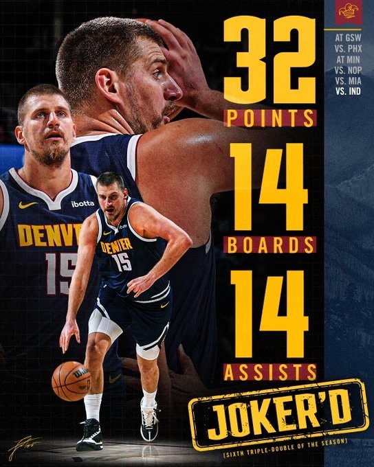 In the NBA regular season, the Nuggets defeated the Pacers 117-100. In this game, Nuggets star Jokic made 10 of 14 shots, 1 of 1 three-pointers, 11 of 12 free throws, and scored 32 points, 14 rebounds, 14 assists and 1 steal in 32 minutes. After the game, the Nuggets officially released a poster of Jokic's statistics and wrote: "He did all these in 32 minutes😮"