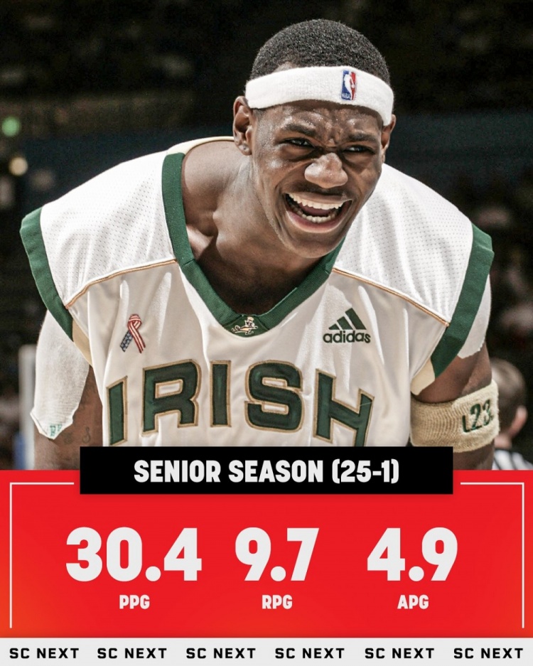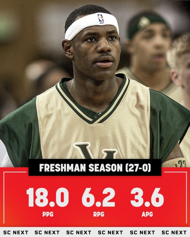 ESPN revealed James' single-season average data and team record during his four-year high school career. In his freshman season, he averaged 18 points, 6.2 rebounds and 3.6 assists per game, and the team had 27 wins and 0 losses. In his sophomore season, he averaged 25.5 points, 7.4 rebounds and 5.5 assists per game, and the team had 26 wins and 1 loss. In his senior season, he averaged 28 points, 8.9 rebounds and 6 assists per game, and the team recorded a record of 23 wins and 4 losses. In his senior season, he averaged 30.4 points, 9.7 rebounds and 4.9 assists per game, and the team had a record of 25 wins and 1 loss.