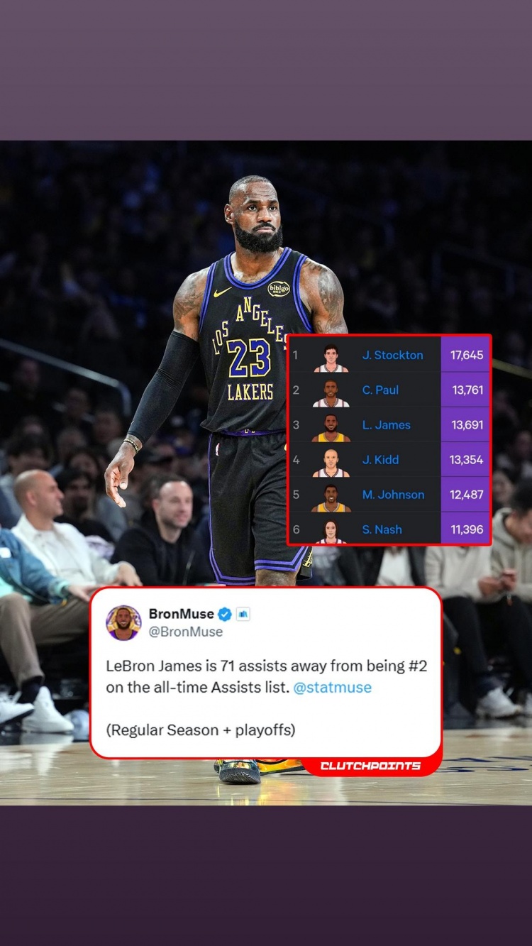 Milestone alert! James has 13,691 assists in the regular season + playoffs, 71 times shy of surpassing Paul, who is second in history.
