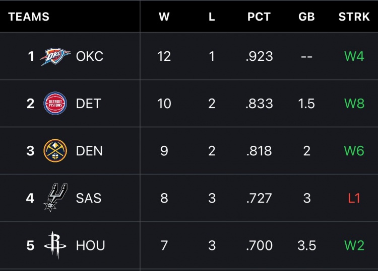 Only one Eastern Conference team! The current top five in the league: Thunder/Pistons/Nuggets/Spurs/Rockets