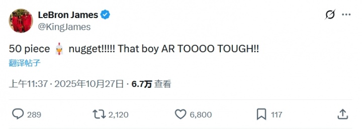 pride! Reeves new high, James tweeted: 50 pieces of chicken nuggets 🐔! That boy is so strong~