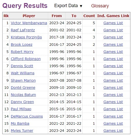 In the NBA regular season, the Spurs defeated the Bulls 121-117. Wenban played 36 minutes in this game, shooting 11 of 19, 6 of 9 three-pointers, 10 of 10 free throws, scoring 38 points, 12 rebounds, 5 assists, 1 steal and 5 blocks. After this game, Wenban scored at least 5 three-pointers and 5 blocks in 6 games, continuing to rank first in history. In NBA history, there are 16 players who have made at least 5 three-pointers and 5 blocks in a single game.