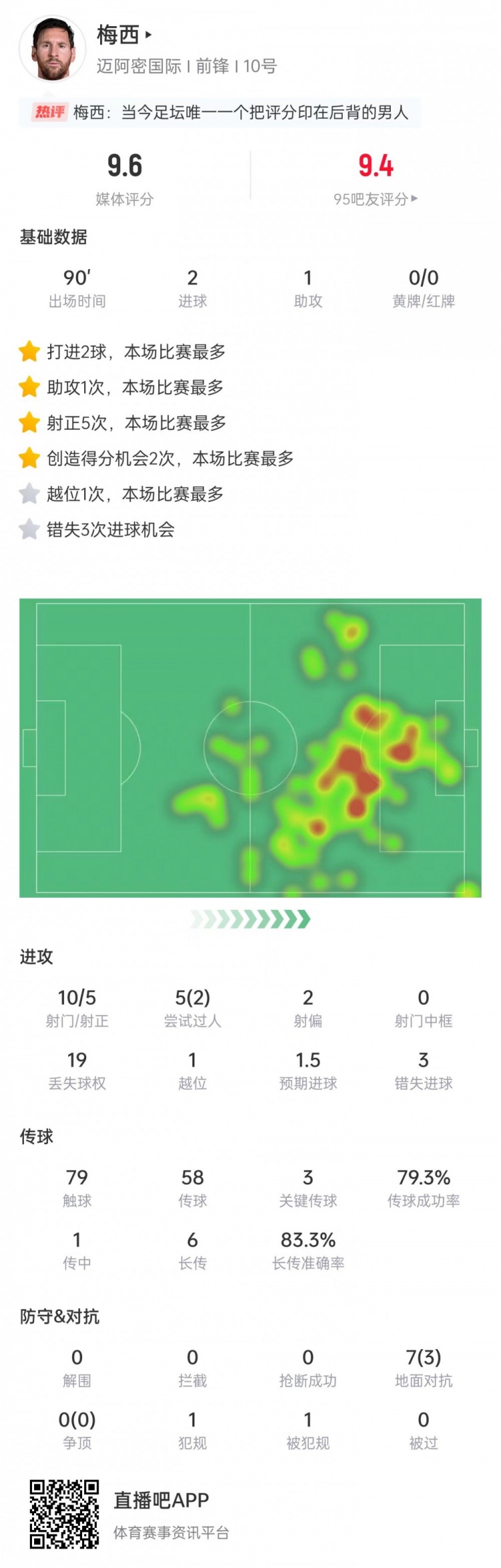 In the MLS game, Messi had 2 shots and 1 pass to help Miami International beat Atlanta United 4-0 at home. Messi’s statistics for this game: Playing time – 90 minutes Goals – 2 Assists – 1 Shots – 10 (5 on target) Attempts – 5 (2 successful) Missed – 2 Lost possession – 19 Offside – 1 Expected goals – 1.5 Missed goal ——3 touches——79 passes——58 key passes——3 pass success rate——79.3% crosses——1 Long passes - 6 (83.3% accuracy) Ground confrontation - 7 (3 successful) Fouls - 1 Fouled - 1 Media rating - 9.6