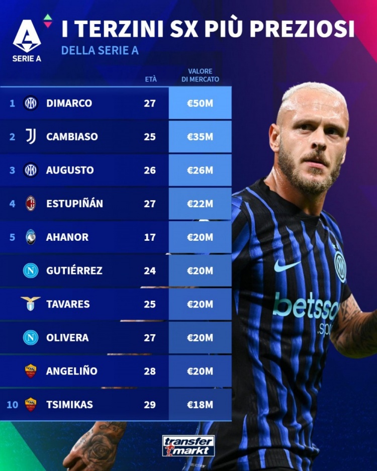 The German transfer market has taken stock of the value of left backs in Serie A, with Dimarco ranking first at 50 million euros. Serie A left back worth ranking: 1. Dimarco (Inter Milan), 27 years old, 50 million euros 2. Cambiaso (Juventus), 25 years old, 35 million euros 3. Augusto (Inter Milan), 26 years old, 26 million euros 4. Estupinian (AC Milan), 27 years old, 22 million euros 5. Ahano (Atalanta), 17 Years old, 20 million euros 5. Gutierrez (Naples), 24 years old, 20 million euros 5. Tavares (Lazio), 25 years old, 20 million euros 5. Olivier La (Naples), 27 years old, 20 million euros 5. Angelino (Roma), 28 years old, 20 million euros 10. Tsimikas (Roma), 29 years old, 18 million euros