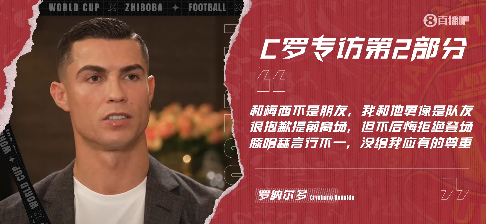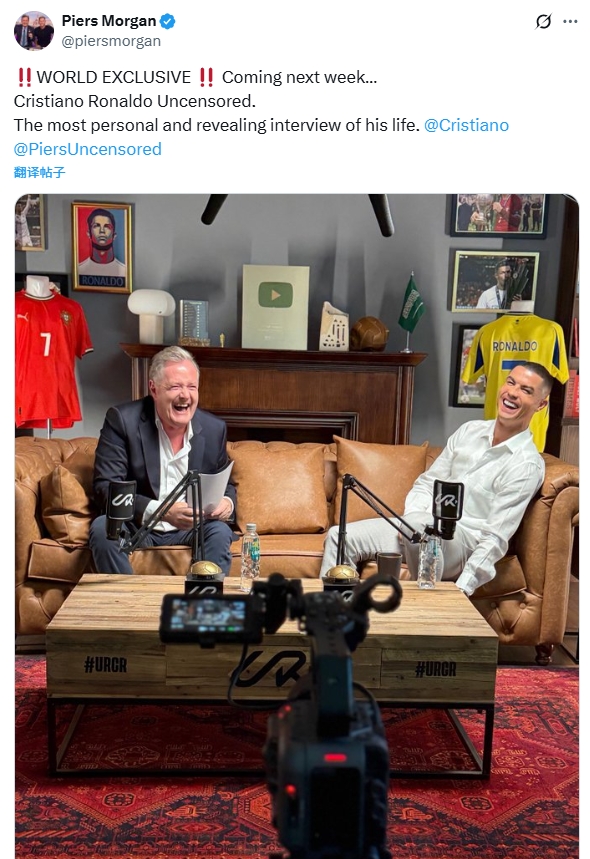 The well-known host Piers Morgan announced on social media that he will release an exclusive interview with Portuguese superstar Cristiano Ronaldo next week.  Morgan wrote:   "!! Global Exclusive!! Will be released next week... The unabridged version of Cristiano Ronaldo's interview. This is the most private and candid interview in his life."   In November 2022, Morgan's exclusive interview with Cristiano Ronaldo detonated the entire football world.  Part of Ronaldo's remarks in the interview at the time ——Talking about Rangnick C Ronaldo: "If you are not even a coach, how can you become the coach of Manchester United? I have not even heard of him." Note: After leaving Schalke in 2011, Rangnick only had two short coaching experiences in 10 years, and became the interim coach of Manchester United in December 2021.  ——Talk about internal suspension C Ronaldo: “Because Ten Hag didn’t show respect to me, so I don’t respect him either. If you don’t respect me, I will never respect you.” ——Talking about Rooney’s criticism C Ronaldo: “I don’t I know why he criticized me like this... maybe because he has retired and I am still playing at a high level. I won't say that I look better than him, but it is the truth."  Full preview of Cristiano Ronaldo's explosive interview: I feel betrayed. It’s okay to rebuild from me  C Ronaldo interview part one: role model for young people | Manchester City rumors | breaking Messi’s record | outside criticism  Crono Ronaldo interview part two: leaving early | evaluating Messi | whether to leave the team | when to retire   The biggest winner! Morgan: This is my favorite interview, thank you Ronaldo, he is outstanding both on and off the field
