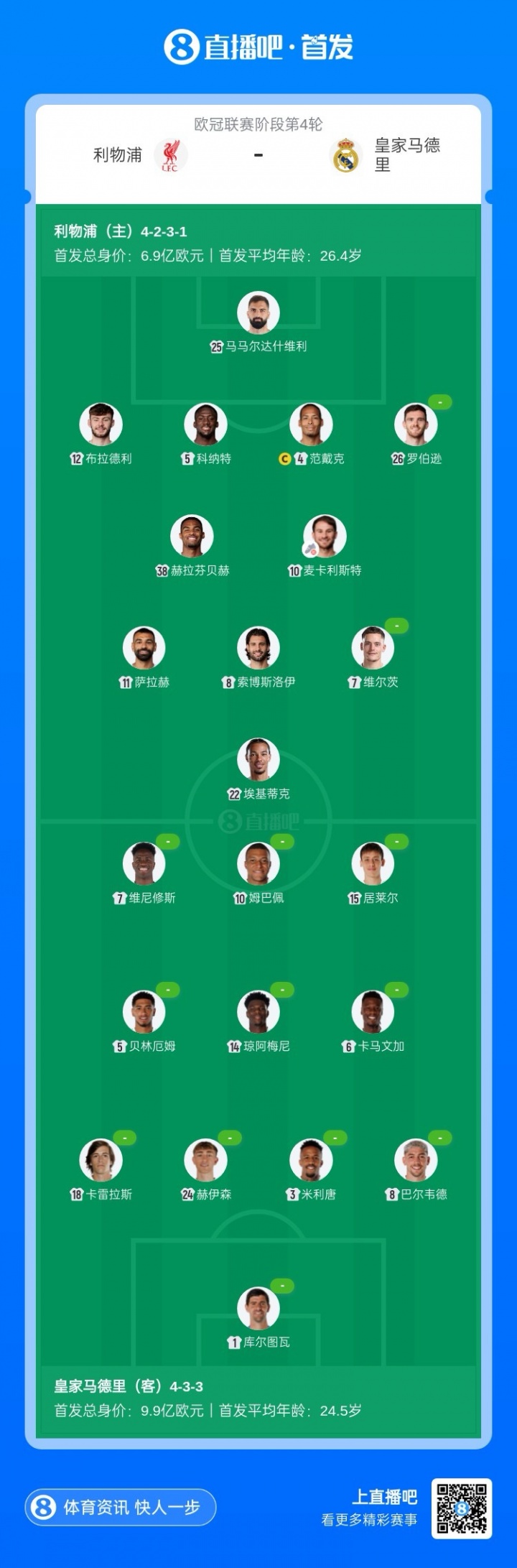 November 5 News The focus of the fourth round of the UEFA Champions League stage, Liverpool vs. Real Madrid at home is about to begin. Started before the game. Liverpool starting lineup: 25-Mamardashvili, 12-Bradley, 5-Konate, 4-Van Dijk, 26-Robertson, 38-Hrafenbech, 8-Szoboszloy, 10-McAllister, 7-Wiltz, 11-Salah, 22-Ekitic Liver Pu Substitutes: 28-Woodman, 74-Miscual, 2-Gomez, 3-Endo Hang, 6-Kyle Kez, 14-Chiesa, 17-Jones, 18-Gakpo, 73-Ngumoha Real Madrid starting: 1-Courtois, 3-Militão, 18-Carreras, 24-Huizen, 5-Bellingham, 6-Camavinga, 8-Valverde, 14-Joan Armeni, 15-Guler, 7-Vinicius, 10-Mbappé Real Madrid substitutes: 13-Lunin, 12-Arnold, 17-Raul Asensio, 20-Fran Garcia, 23-Ferran Mendy, 2 6-Flan Gonzalez, 19-Ceballos, 9-Enderrick, 11-Rodrigo, 16-Gonzalo Garcia, 21-Dias [Pre-match information]