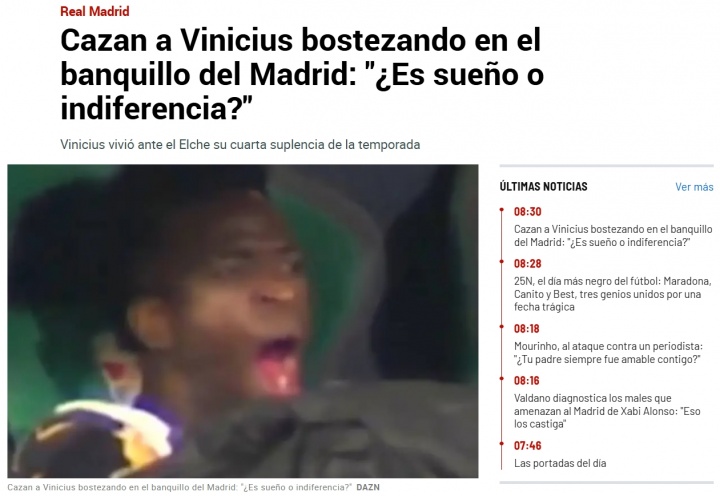According to "Marca", Vinicius was photographed yawning on the bench during Real Madrid's 2-2 away draw with Elche in the last round of La Liga. This game was Vinicius's fourth substitute appearance this season. He came on the scene in the 57th minute and indirectly participated in Real Madrid's equalizing goal. When Real Madrid fell behind in this game, the camera captured Vinicius yawning on the bench. Marca asked: Is he sleepy or indifferent to the team?