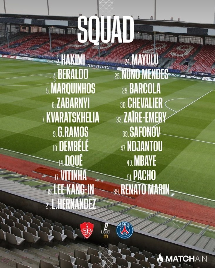 In this round of Ligue 1, Paris will face Brest away from home. The team officially announced the roster for this game, as follows: Goalkeepers: 30-Chevalier, 39-Safonov, 89-Marin Defenders: 2-Achraf, 4-Berardo, 5-Marquinhos, 6-Zabarni, 21-Lucas-Egypt Hernandez, 25-Nuno Mendes, 51-Pacho Midfielder: 17-Vitinha, 24-Mayulu, 33-Zaire Emery Forward: 7 -Kvaratschelia, 9-Gonzalo Ramos, 10-Dembele, 14-Douai, 19-Li Gangren, 29-Barkola, 47-Njarntu, 49-Mbaye