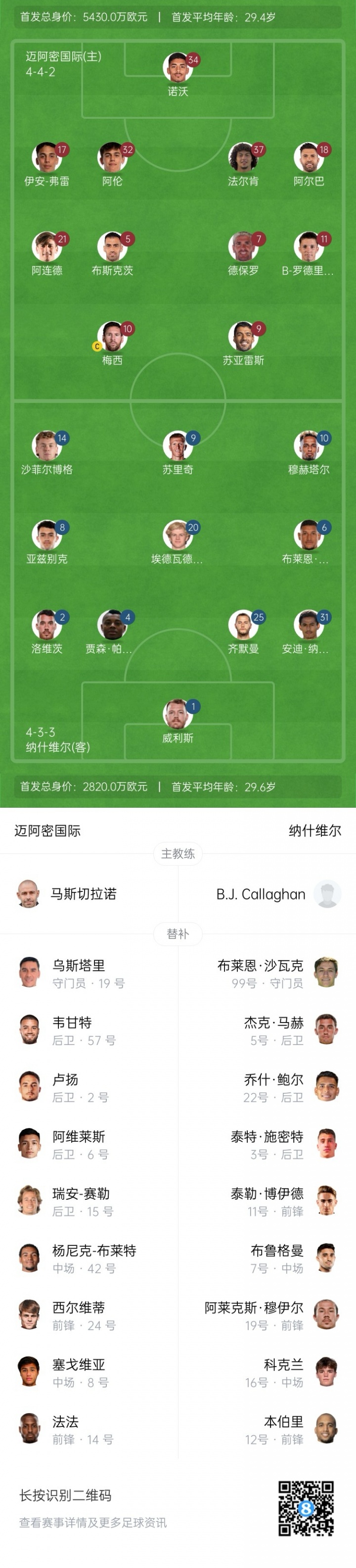 In the first round of the MLS playoffs, Inter Miami faced Nashville. The starting lineup was announced before the game. Miami International starting lineup: 34-Novo, 17-Ian Frey, 37-Falcon, 32-Allen, 18-Alba, 21-Allende, 7-De Paul, 5-Busquets, 10-Messi, 11-B Rodriguez, 9-Suarez Miami International Substitutes: 19-Ustari, 57-Weigandt, 15-Ryan Sailor, 2-Lujan, 6-Aviles, 42-Bright, 8-Segovia, 14-Fafa Nashville starting: 1-Willis, 2-Lowitz, 4-Jason Palacio Si, 25-Zimmerman, 31-Andy Nagar, 6-Brian Acosta, 8-Yazbek, 20-Edward Takis, 0-Mukhtar, 14-Shaferberg, 9-Surich Nashville substitutes: 99-Brian Shavak, 3-Tate ·Schmidt, 5-Marr, 7-Bruggemann, 11-Tyler Boyd, 12-Benbury, 16-Cochran, 19-Alex Muir, 22-Josh Ball The first round of the American League playoffs adopts a best-of-three game system. After a tie in regular time, there will be a penalty shootout.