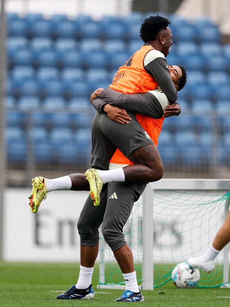 Return to training after apology! Real Madrid official photo: Vinicius and Bellingham share a passionate bear hug