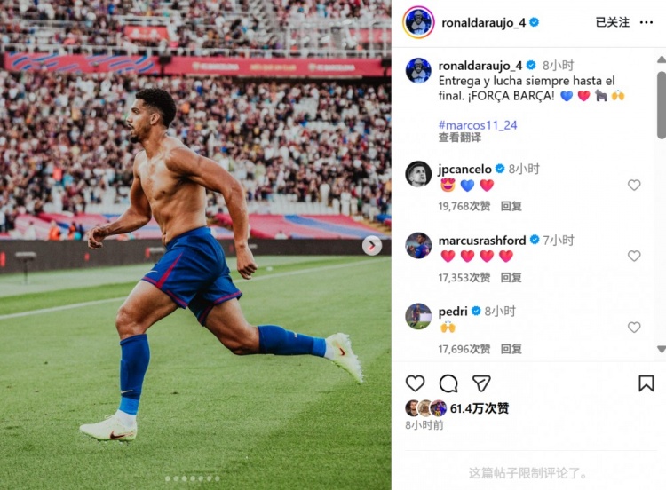 In this round of La Liga, Barcelona narrowly defeated Girona 2-1. Araujo came off the bench to complete the stoppage time winner. After the game, Araujo also posted a photo on social media of taking off his clothes to celebrate after scoring a goal. The caption read: "Always try your best and persevere until the last moment, come on Barcelona!"