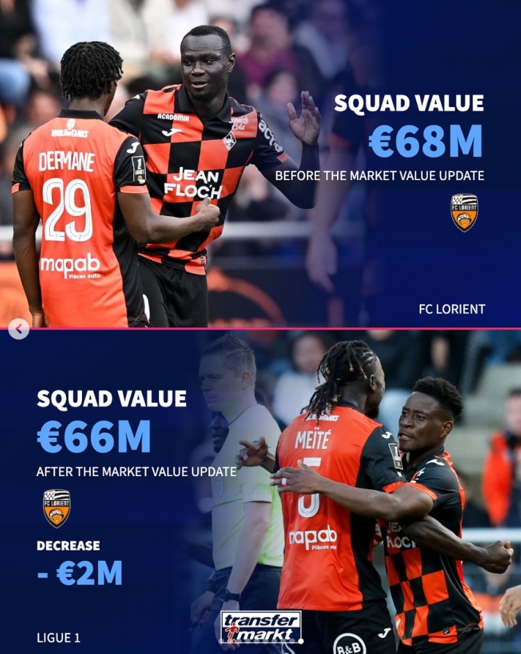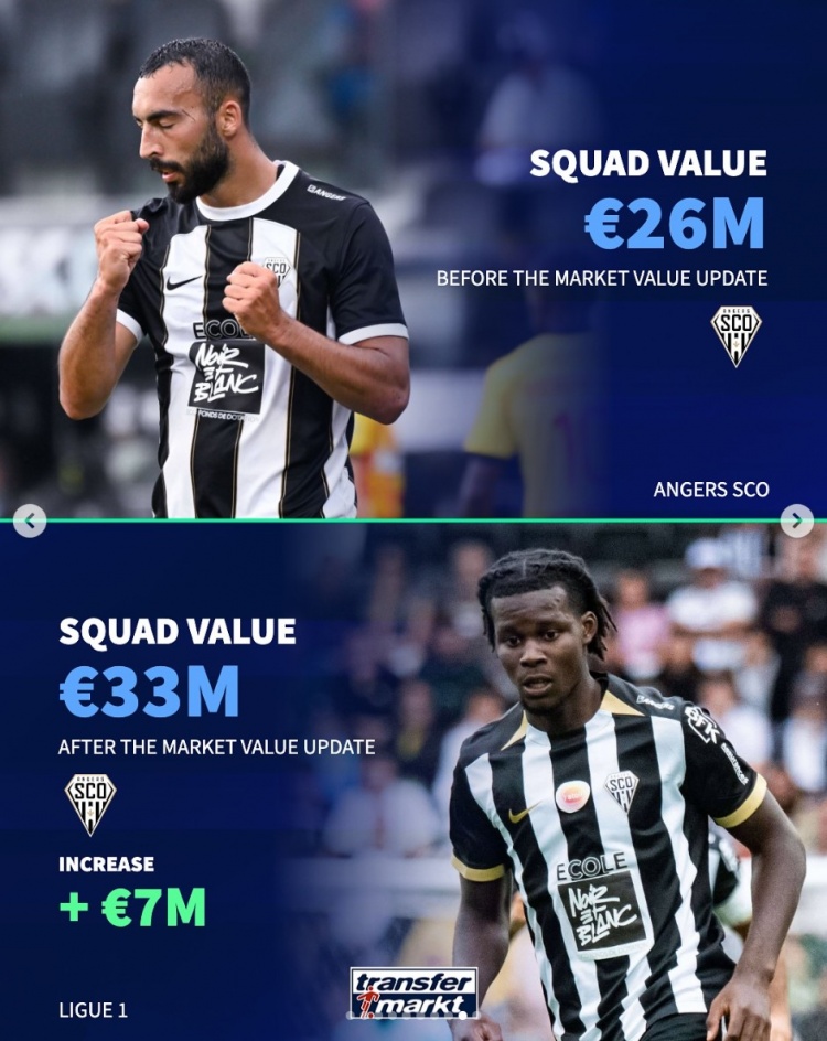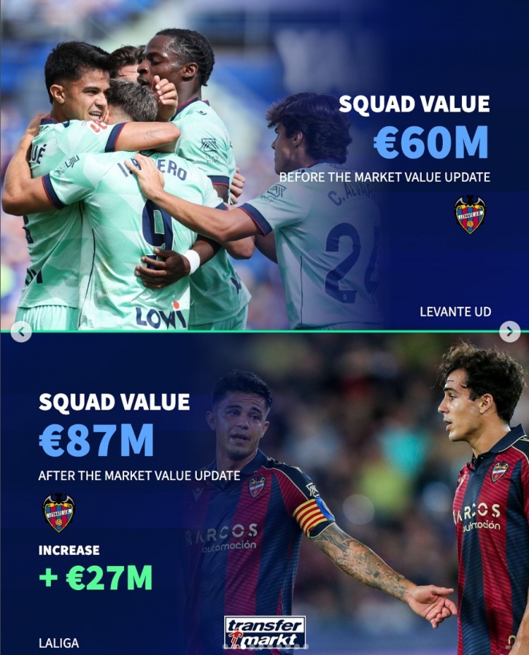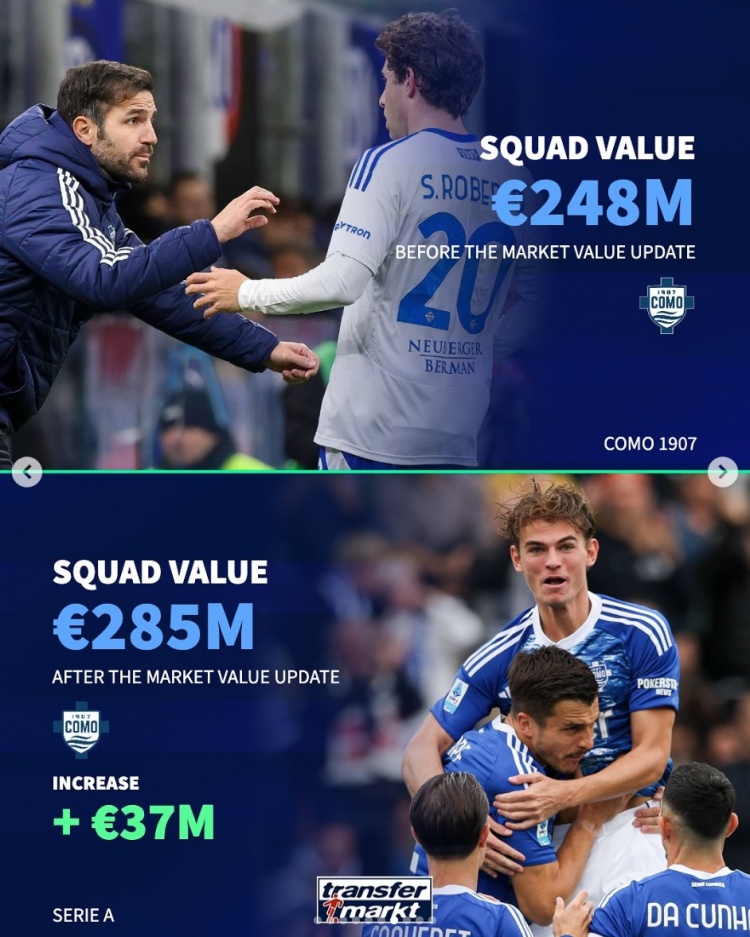 "Transfer Market" has recently updated the value of the teams in the five major leagues. They have also listed the teams with the largest increase and decrease in value (in euros) after the latest price update in each major league. Premier League: Sunderland +50 million: 290 million → 340 million Manchester City - 20 million: 1.23 billion → 1.21 billion La Liga: Levante +2 7 million: 60 million → 87 million Real Sociedad - 40 million: 293 million → 253 million Bundesliga: Cologne + 29 million: 77 million → 106 million Werder Bremen - 17 million: 195 million → 178 million Serie A: Como + 37 million: 248 million → 285 million Turin - 11 million: 164 million → 153 million Ligue 1: Angers + 7 million: 26 million → 33 million Lorient - 2 million: 68 million → 66 million