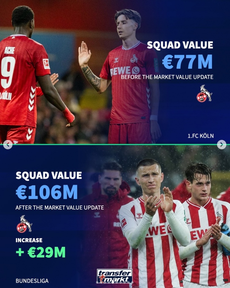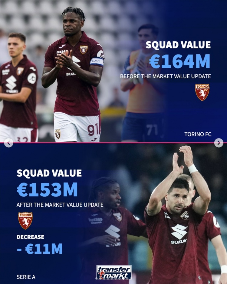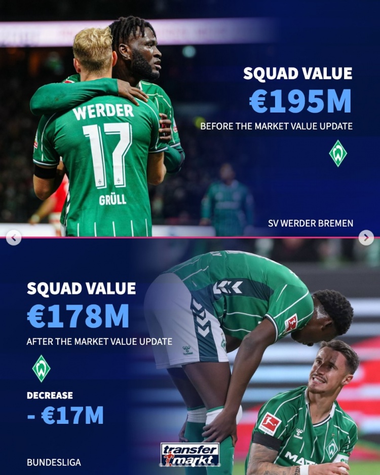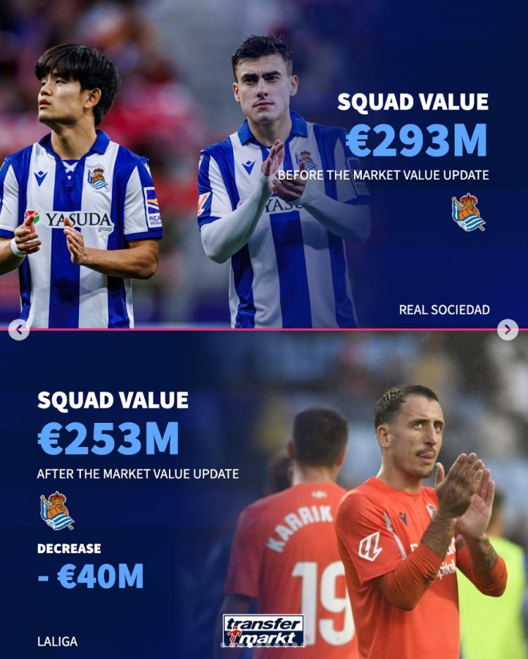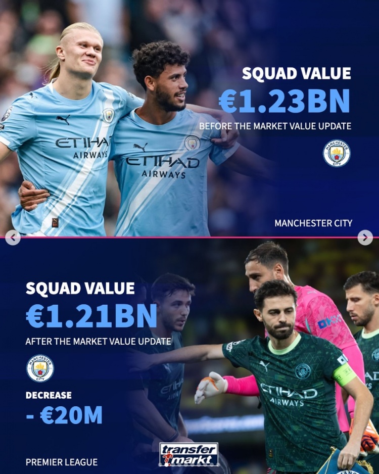 "Transfer Market" has recently updated the value of the teams in the five major leagues. They have also listed the teams with the largest increase and decrease in value (in euros) after the latest price update in each major league. Premier League: Sunderland +50 million: 290 million → 340 million Manchester City - 20 million: 1.23 billion → 1.21 billion La Liga: Levante +2 7 million: 60 million → 87 million Real Sociedad - 40 million: 293 million → 253 million Bundesliga: Cologne + 29 million: 77 million → 106 million Werder Bremen - 17 million: 195 million → 178 million Serie A: Como + 37 million: 248 million → 285 million Turin - 11 million: 164 million → 153 million Ligue 1: Angers + 7 million: 26 million → 33 million Lorient - 2 million: 68 million → 66 million