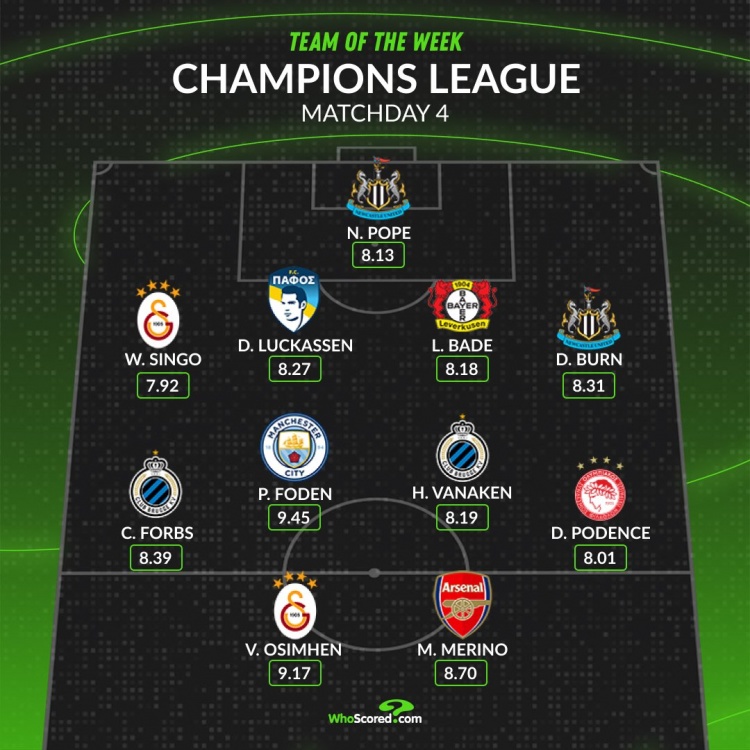 WhoScored listed the Champions League's best team of the week, including Osimhen, Merino, Foden and Dan Byrne. WhoScored Champions League Team of the Week Goalkeeper: Pope (Newcastle) Defenders: Singh (Galatasaray), Lucassen (Paphos), Badet (Leverkusen), Dan Byrne (Newcastle) ) Midfielder: Borges (Club Brugge), Foden (Manchester City), Vanaken (Club Brugge), Daniel Podence (Olympiakos) Forward: Osimhen (Galatasaray), Merino (Arsenal)